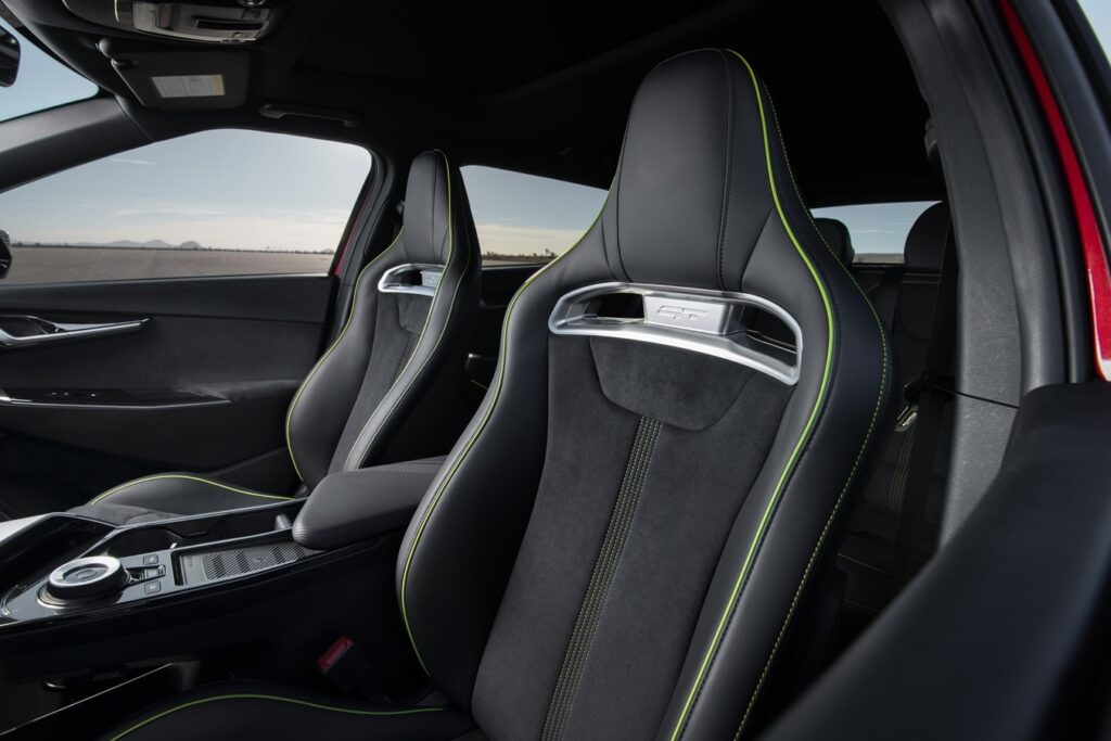 También hay un motivo de rayas picantes en la parte superior del tablero y el reposabrazos central, así como sonidos dinámicos adicionales, que se bombean a través de los parlantes para brindar el equivalente EV del ruido del motor.